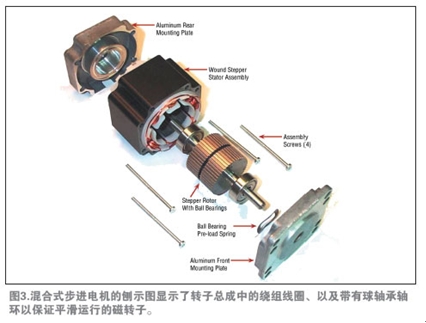 混hun合he式shi步bu進jin電dian機ji結jie合he了le永yong磁ci和he開kai關guan磁ci阻zu電dian機ji的de工gong作zuo原yuan理li,在zai轉zhuan子zi軸zhou上shang裝zhuang有you一yi對dui或huo多duo對dui外wai圓yuan周zhou有you很hen多duo齒chi的de定ding子zi疊die片pian,在zai每mei對dui定ding子zi疊die片pian間jian有you一yi個ge永yong磁ci體ti,會hui在zai軸zhou向xiang上shang生sheng成cheng北bei極ji和he南nan極ji。齒chi的de數shu量liang、電機結構與驅動方案等幾項因素確定了電機的步進角度,多數應用指定了混合式步進電機1.8°的步長(每轉200步長)(見參考資料)。