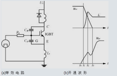 由圖1波形可看出,由於Le和Cgc的存在,在IGBT的實際運行中uge的上升速率減緩了許多,這種阻礙驅動電壓上升的效應,表現為對集電極電流上升及開通過程的阻礙。為了減緩此效應,應使IGBT模塊的Le和Cgc及柵極驅動電路的內阻盡量小,以獲得較快的開通速度。
