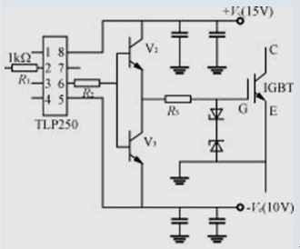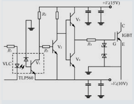 圖3為采用光耦合器等分立元器件構成的IGBT驅動電路。當輸入控製信號時,光耦VLC導通,晶體管V2截止,V3導通輸出+15V驅動電壓。當輸入控製信號為零時,VLC截止,V2、V4導通,輸出-10V電壓。+15V和-10V電源需靠近驅動電路,驅動電路輸出端及電源地端至IGBT柵極和發射極的引線應采用雙絞線,長度最好不超過0.5m。