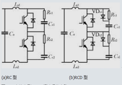 為了使IGBT關斷過電壓能得到有效的抑製並減小關斷損耗,通常都需要給IGBT主電路設置關斷緩衝吸收電路。IGBT的關斷緩衝吸收電路分為充放電型和放電阻止型。充放電型有RC吸收和RCD吸收2種。如圖6所示。
