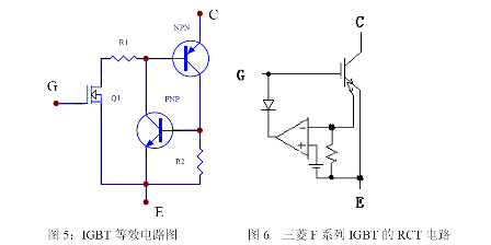 IGBT 有一定抗過電流能力,但必須注意防止過電流損壞。IGBT 複合器件內有一個寄生晶閘管,所以有擎住效應。圖5 為一個IGBT 的等效電路,在規定的漏極電流範圍內,NPN 的正偏壓不足以使NPN 晶體管導通,當漏極電流大到一定程度時,這個正偏壓足以使NPN 晶體管開通,進而使NPN 和PNP 晶體管處於飽和狀態,於是寄生晶閘管開通,門極失去了控製作用,便發生了擎住效應。IGBT 發生擎住效應後,漏極電流過大造成了過高的功耗,最後導致器件的損壞。
