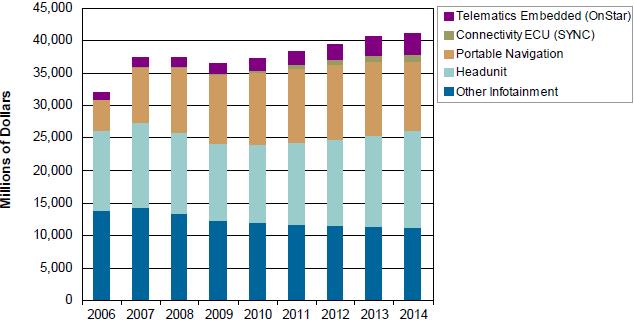 圖1所示為iSuppli公司關於2006-2014年全球汽車信息娛樂係統銷售額的預測。