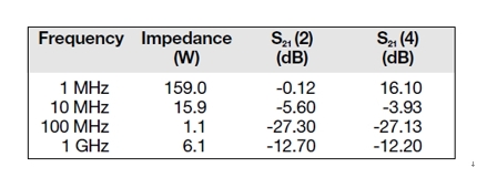 作為一個例子,表1中給出了對一隻1000-pF的旁路電容器測出的阻抗及由此計算出來的插入損耗。所有的插入損耗數據都基於50歐阻抗。如表中所給出,一旦電容器的阻抗開始增加到50歐,方程3將快速發生突變。