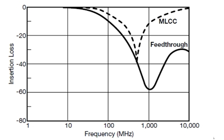 對dui於yu寄ji生sheng參can數shu來lai說shuo,這zhe種zhong幾ji何he結jie構gou具ju有you幾ji個ge有you趣qu的de問wen題ti。首shou先xian,電dian容rong器qi的de寄ji生sheng電dian感gan要yao比bi具ju有you等deng效xiao電dian容rong的de相xiang當dang尺chi寸cun的de片pian式shi電dian容rong器qi要yao小xiao得de多duo。可ke以yi測ce量liang穿chuan心xin電dian容rong的de寄ji生sheng電dian感gan,大da約yue為wei250pH。該相同的現象是在降低了電感的同時也降低了ESR(通道長度,通道長度,通道長度!)最後,穿通部分中電感的引入將增加衰減帶寬。圖8給出了一隻100pF的穿心電容和一個等效的標準片式電容之間的插入損耗比較。