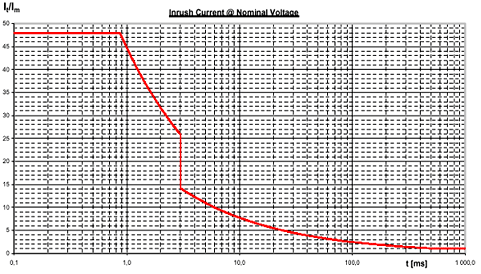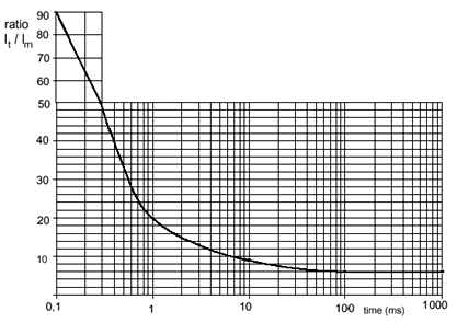 歐洲電信標準協會(the European Telecommunications Standards Institute)對用於通信係統的開關電源的衝擊電流大小做了規定,圖3為通信係統用AC/DC電源供電時的最大衝擊電流限值[4],圖4為通信係統在DC/DC電源供電,標稱輸入電壓和最大輸出負載時的最大衝擊電流限值[5]。圖中It為衝擊電流的瞬態值,Im為穩態工作電流。