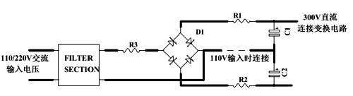 圖5所示為衝擊電流限製電阻的通常位置,對於110V、220V雙電壓輸入電路,應該在R1和R2位置放兩個電阻,這樣在110V輸入連接線連接時和220V輸入連接線斷開時的衝擊電流一樣大。對於單輸入電壓電路,應該在R3位置放電阻。