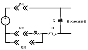 圖7所示電路為長短針法衝擊電流限製電路,在DC/DC電源板插入時,長針接觸,輸入電容C1通過電阻R1充電,當電源板完全插入時,電阻R1被斷針短路。C1代表DC/DC電源的所有電容量。