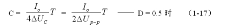 (1-17)和(1-18)式,就是計算串聯式開關電源儲能濾波電容的公式(D = 0.5時)。式中:Io是流過負載的電流,T為控製開關K的工作周期,ΔUP-P為輸出電壓的波紋。電壓波紋ΔUP-P一般都取峰-峰值,所以電壓波紋正好等於電容器充電或放電時的電壓增量,即:ΔUP-P = 2ΔUc 。