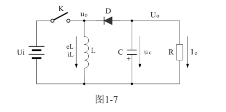 圖1-7中,Ui為輸入電源,K為控製開關,L為儲能電感,D為整流二極管,C為儲能濾波電容,R為負載電阻。當控製開關K接通的時候,輸入電源Ui開始對儲能電感L加電,流過儲能電感L的電流開始增加,同時電流在儲能電感中也要產生磁場;當控製開關K由接通轉為關斷的時候,儲能電感會產生反電動勢,使電流繼續流動,並通過整流二極管D進行整流,再經電容儲能濾波,然後向負載R提供電流輸出。控製開關K不斷地反複接通和關斷過程,在負載R上就可以得到一個負極性的電壓輸出。