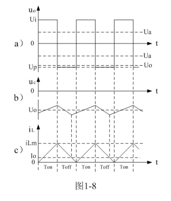 式中–Uo前的負號,表示K關斷期間電感產生電動勢的方向與K接通期間電感產生電動勢的方向正好相反。對(1-22)式進行積分得: