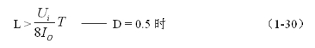 當儲能濾波電感L的值大於(1-29)式的值時,流過儲能電感L的電流上升率將減小,輸出電壓Uo將降低,但濾波輸出電壓Uo的電壓紋波顯著減小;如果為了維持電源濾波輸出電壓Uo不變,控製開關K必須要把占空比D增大,而占空比D的增大又會使流過儲能電感的電流iL不連續的時間縮短,或由電流不連續變成電流連續,從而使電源濾波輸出電壓Uo的電壓紋波降低。