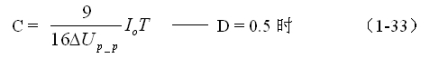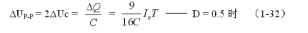 (1-33)和(1-34)式,就是計算反轉式串聯開關電源儲能濾波電容的公式(D = 0.5時)。式中:Io是流過負載電流的平均值,T為開關工作周期,ΔUP-P為濾波輸出電壓的波紋,或電壓紋波。一般波紋電壓都是取電壓增量的峰-峰值,因此,當D = 0.5時,波紋電壓等於電容器充電的電壓增量,即:ΔUP-P = 2ΔUc 。