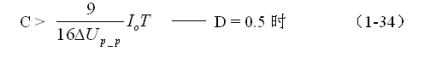 同理,(1-33)和(1-34)式的計算結果,隻給出了計算反轉式串聯開關電源儲能濾波電容C的中間值,或平均值,對於極端情況可以在平均值的計算結果上再乘以一個大於1的係數。