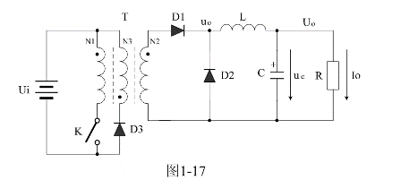 圖1-17是正激式變壓器開關電源的簡單工作原理圖,圖1-17中Ui是開關電源的輸入電壓,T是開關變壓器,K是控製開關,L是儲能濾波電感,C是儲能濾波電容,D2是續流二極管,D3是削反峰二極管,R是負載電阻。