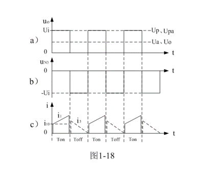 圖1-17中,在Ton期間,控製開關K接通,輸入電源Ui對變壓器初級線圈N1繞組加電,初級線圈N1繞組有電流i1流過,在N1兩端產生自感電動勢的同時,在變壓器次級線圈N2繞組的兩端也同時產生感應電動勢,並向負載提供輸出電壓。開關變壓器次級線圈輸出電壓大小由(1-63)、(1-69)、(1-76)、(1-77)等式給出,電壓輸出波形如圖1-18-a)。