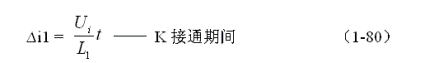 另外,流過正激式開關電源變壓器的電流i1除了i10之外還有一個勵磁電流,我們把勵磁電流記為∆i1。從圖1-18-c)中可以看出,∆i1就是i1中隨著時間線性增長的部份,勵磁電流∆i1由下式給出: