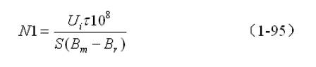 (1-95)式就是計算單激式開關電源變壓器初級線圈N1繞組匝數的公式。式中,N1為變壓器初級線圈N1繞組的最少匝數,S為變壓器鐵心的導磁麵積(單位:平方厘米),Bm為變壓器鐵心的最大磁感應強度(單位:高斯),Br為變壓器鐵心的剩餘磁感應強度(單位:高斯),Br一般簡稱剩磁,τ = Ton,為控製開關的接通時間,簡稱脈衝寬度,或電源開關管導通時間的寬度(單位:秒),一般τ取值時要預留20%以上的餘量,Ui為工電壓,單位為伏。式中的指數是統一單位用的,選用不同單位,指數的值也不一樣,這裏選用CGS單位製,即:長度為厘米(cm),磁感應強度為高斯(Gs),磁通單位為麥克斯韋(Mx)。
