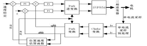 參考圖1,本係統中通過單電流采樣,在DSP中實現電流鑒別算法和濾波算法,得到對應的三相電流,通過速度位置估算算法計算出電機轉子的當前位置和速度,然後利用PI反饋算法生成新的PWMzuoyongyudianjizhishang,wanchengyigekongzhiliucheng。zheyangxunhuanwangfu,shixianledianjicongqidongdaozhengchangyunzhuanyijitiaosudegongneng,xiamianjiangfenbiechanshugebufendeyuanliyushixian。