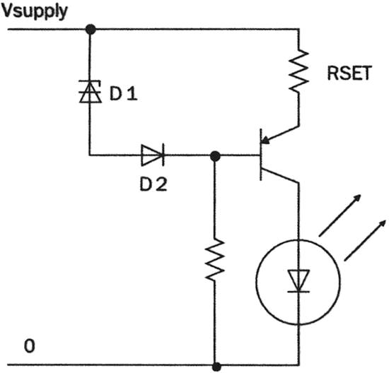 相對簡單的方案是使用線性降壓穩壓器(圖1),D1是一個穩壓二極管,通過LED的電流設定為VD1/RSET。D2對基極二極管進行濕度補償。這個電路仍然存在能量損失問題和電阻散熱問題。對於低電流LED,尤其是串聯後的LED正向壓降和稍低於電源電壓的場合,這個電路不失為經濟有效的方案。