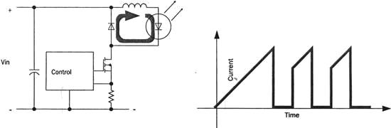 最簡單的開關穩壓器是圖2所示的降壓穩壓器,輸入電壓與LED電壓之間的壓差對電感L充電,電流隨之增加,當電流達到預設的值時,控製電路將串聯的晶體管關閉,在LED通路形成一個交變電流。注意,在LED驅動應用中,開關穩壓電路控製電流的峰值。