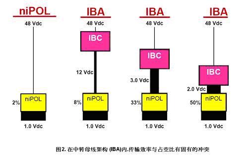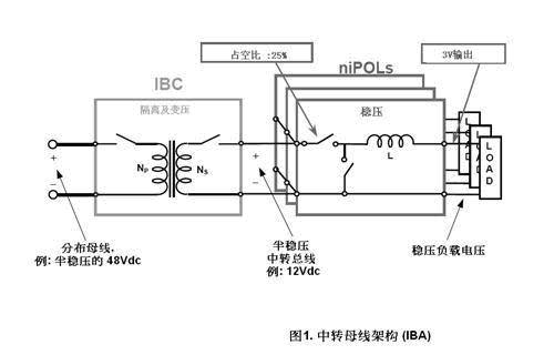 IBA的理念是把母線電壓降至一個稍稍高於負載點的電壓,再由較便宜的降壓器(niPoL)來完成餘下的工作。降壓器(niPoL)經由電感器傳輸電壓到負載,這電壓相等於上開關和下開關共同端電壓的平均值,等如上開關電壓占空比與中轉母線的乘積。