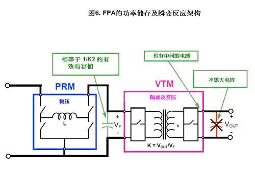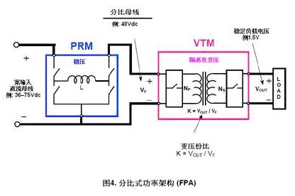 跟分布式架構或中轉母線架構不一樣,在分比式架構,穩壓功能由PRM提供,可遠離負載。VTM作為負載點的轉換器,它不需要提供穩壓的功能,可以無須靠近負載。它隻負責按K比值“倍大電流”或“降低電壓”(VOUT=VfK),VTM可在整個轉換周期傳送電流,它的占空比是百份之一百。FPA以分比母線傳輸功率,可以較隨意的選擇電壓,無須如前所述的IBA架構,因固有的衝突,中轉電壓隻能選定在稍高於負載的電壓,否則它的占空比將無法管理。