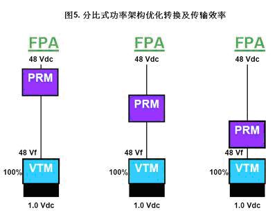 [page]由於VTM負責在負載點變壓,它的K比值最高可達到200,分比母線因此無須受負載電壓限製,可設定在任何一點上,甚至可把分比母線設定跟電源電壓相同。如圖5,負載電壓是1V,分比母線可設定為48V,完全不受負載電壓或PRM與VTM的距離影響,不需在輸送損耗與轉換損耗中折衝取舍。重點是FPA把變壓的部份放在負載點,克服了IBA麵對的難題,占空比可達100%。