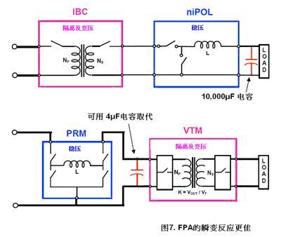 FPA的瞬變反應較IBA理想。如前述,IBA把電感器放在中轉母線與負載之間,產生電流慣性。在FPA分比母線與負載之間沒有電感器(圖6),由於VTM不受電感慣性左右,可快速的反應負載變化。在分比母線的電容由於沒有電感的阻隔,可對負載有效旁路,該電容相等於在負載加上1/K2倍電容值,這便無須在負載點加上大電容。圖7清楚表示在FPA隻需用上4uF的電容便可以取代IBA中的10000uF電容。
