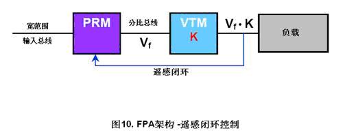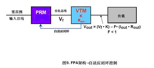 自適應閉環(圖9)。由VTM把訊號傳送給PRM,讓PRM調整分比母線。以補償VTM的輸出阻抗。自適應閉環隻需要在VTM與PRM之間接上簡單、非隔離的反饋電路,它的穩壓精度便可達+/-1%。
