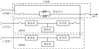 目前,為了提高UPS的可靠性,主要采用主從結構的UPS“1+1”並聯備份,如圖4所示。雖然這樣在一定程度上提高了供電可靠性,但是不便於離線維護、擴容,同時也造成設備利用不充分、缺乏靈活性等方麵的缺陷。對於一些不能夠停電的用戶(例如醫療、銀行、金融、通信、國防等行業),UPS“1+1”並聯備份,還是存在很大的電力係統癱瘓隱患。