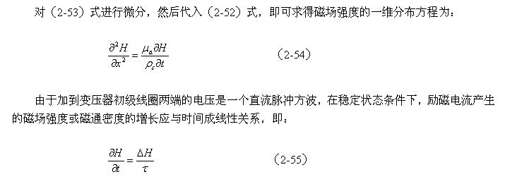 當有一個直流脈衝電壓加到變壓器初級線圈的兩端時,在變壓器初級線圈中就就有勵磁電流通過,並在變壓器鐵芯中產生磁場強度H和磁通密度B,兩者由下式決定: