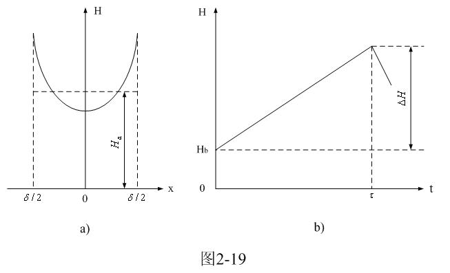 圖2-19-a和圖2-19-b分別是由(2-61)式給出的,鐵芯片中磁場強度按水平方向分布的函數H(x)和按時間分布的函數H(t)曲線圖。