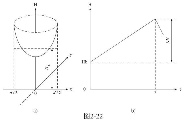 圖2-22-a和圖2-22-b是圓柱形鐵芯中磁場強度按水平分布的函數H(x,y)曲麵圖和按時間分布的函數H(t)曲線圖。