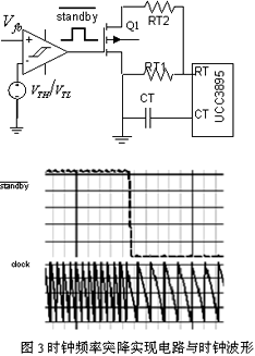 突降實現方法如圖3:以UCC3895為例,當電源處於正常負載狀態時,Q1導通,其時鍾周期為: