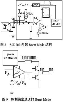 而FSD200則是通過控製內部驅動器實現可控脈衝模式,即將Vfo 腳的反饋電壓與0.6V/0.5V遲滯比較器比較,由比較結果控製門極驅動輸出,其結構可見圖8。我們可根據此原理用分立元件實現普通芯片的BurstMode功能,即檢測次級電壓判斷電源是否處於待機狀態,通過遲滯比較器,控製芯片輸出,電路如圖9所示。