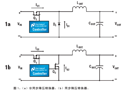 圖1是非同步和同步降壓轉換器的原理圖。非同步降壓轉換器使用FET和肖特基二極管作為開關器件(圖1a),當FET打開時,能量傳遞到輸出電感和負載。當FET關斷,電感中的電流流過肖特基二極管。如果負載電流高於輸出電感的紋波電流的一半,則轉換器工作在連續導通模式。