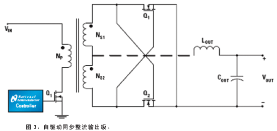 自驅動方案是最簡單、直接的SR驅動方案(圖3),適合於那些在任何時間段內變壓器電壓都不為零的拓撲結構。兩個SRFET可替代輸出整流二極管,次級繞組產生的電壓驅動SR的柵極。在大多數情況下,利用不同的變壓器線圈匝數比(NP∶NS1∶NS2)和正確選擇SRFET,相同的拓撲結構可以獲得更高或更低的輸出電壓。