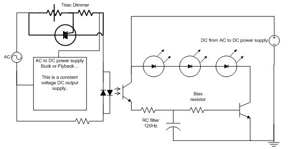 120Hz信號經一個電阻/電容濾波器處理為代表AC電壓占空比的電壓,並經由TRIAC調光器提供給電源。可通過多種方法利用這個電壓來控製LED電流。在圖示電路中,利用兩個電阻把雙極結型晶體管(bipolarjunctiontransistor,BJT)偏置到所需的最大負載電流,並假設光耦合器完全導通(占空比=100%),濾波器電容被充電到最大電勢能量。鑒於VCC一般都很低,小於~24V,所以電容的尺寸很小,即使其數值往往相當大,足以作為120Hz濾波器。