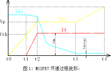 MOSFET開通過程中的波形見圖1所示,其開通的過程可分為四個階段: