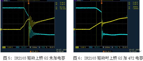 圖5和圖6是實際應用中的測試波形,從圖中我們可以看出:①電容的增加使得開啟的時間變長,增加了開通損耗。②電容的增加,使得門極電壓的高頻震蕩減少。同時,由於米勒平台的振蕩減小,MOSFET在米勒平台期間的損耗也會相應減小。