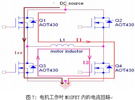 延長MOSFET的開通時間可以減小開通時的湧入電流。由於電機負載為感性負載,所以在PWM關斷時存在續流現象(見圖7中的I2),為了減小續流側反向恢複電流(Irr)的大小,PWM側開關管的開通速度不宜過快。由於MOSFET處於飽和區時有公式:Id=K*(Vgs-Vth)2,(K為一常數,由MOSFET的特性決定)。所以在一定的溫度和Vds條件下,從MOSFET的門極驅動電壓Vgs可以判斷MOSFET中的電流大小。圖5中Vgs峰值為9.1V,圖6中Vgs峰值為6.4V,所以增加電容使得峰值電流減小。Id也可從MOSFET的轉移特性圖中獲得。