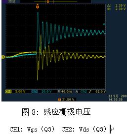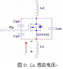 感應柵極電壓如圖8中的CH1所示,其值已達到2.3V。另外,由於源極引線電感的存在,在Q3內的電流迅速減小時,會在Ls的兩端感應出一個極性為上負下正的電壓,如圖9所示,此時加在DIE上的電壓Vgs(die)要大於在外部引腳上測量的Vgs電壓,所以由於Ls的影響,使得MOSFET有提前導通的可能。如果下管由於感應電壓而導通,則會造成上下管穿通,如果MOSFET不能承受此穿通電流,MOSFET就會損壞。