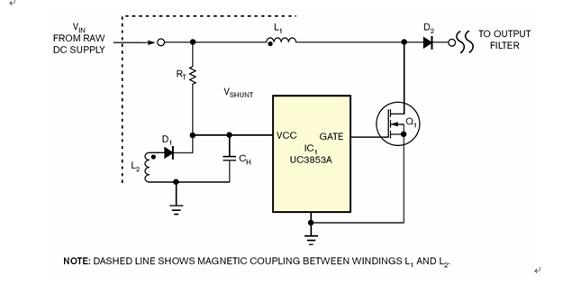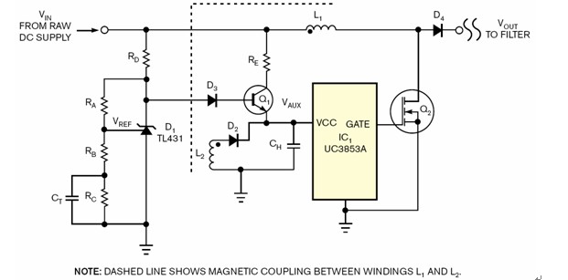 這個電路如同圖1所示,其中的二極管D2和輔助線圈L2會提供正常操作電源給IC1。