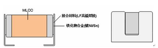 金屬端子通過接合材料(LF高溫焊接)與電容器的外部電極相結合,使金屬端子成為接合電路板的媒介。金屬端子的形狀采用能夠降低嘯叫效果的U字形。它隻是與電容器上壓電效應比較小的WT麵外側部分結合,從而減低電容器振動的傳遞。