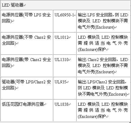 4.其它要求:如LED電源、LED數組、LED模塊及LED控製模塊等安全及外殼要求等。LED的電源可以是下列標準所驗證的電源供應器,包括UL1012,UL1310及UL60950-1。基本上,LED數組、LED模塊及LED控製模塊隻要位於LPS/Class2安全回路上,就沒有任何電氣外殼的要求。LED燈具對於電源輸出方式的規定為基本絕緣,與完全沒有隔離是一樣的。對於LED數組、LED模塊及LED控製模塊,如果使用的電源不用大到超過LPS/Class2,建議最好要符合LPS/Class2。反之,若使用的能量將大於LPS/Class2,則有沒有提供隔離一次側與二次側電源電路的絕緣,對塑料外殼的要求上,是沒有差別的。