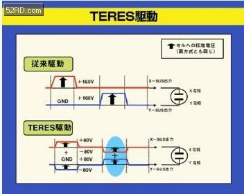 為了降低PDP的用電,Fujitsu-Hitachi(富士通日立,富士通也是PDP的發創業者)提出了TERES(TechnologyofReciprocalSustainer)技術,將X、Y電極的電位交替由「0V:160V、160V:0V」改成「+80V:-80V、-80V:+80V」的方式,同時為彌補驅動電壓的改變而將交替頻率提升一倍。