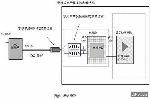 為了評估DC電源線上的EMI靜噪濾波器的噪聲抑製效果,我們做了一個模擬便攜式設備的評估電路板(如圖3所示)。它是通過AC適配器取得DC電源,同時配備了一個類似於電源功能塊的DC/DC轉換器電路,並安置了一個類似於內部數字處理電路的時鍾動作電路。