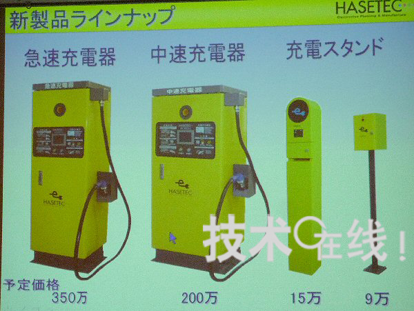 “快速充電器在電動汽車的普及中不可或缺。作為最先開發出快速充電器的企業,我們將繼續積極努力”,Hasetec代(dai)表(biao)董(dong)事(shi)社(she)長(chang)千(qian)村(cun)正(zheng)如(ru)此(ci)表(biao)示(shi)。該(gai)公(gong)司(si)日(ri)前(qian)擴(kuo)充(chong)了(le)電(dian)動(dong)汽(qi)車(che)用(yong)充(chong)電(dian)器(qi)的(de)產(chan)品(pin)陣(zhen)容(rong)。除(chu)改(gai)進(jin)了(le)原(yuan)來(lai)的(de)快(kuai)速(su)充(chong)電(dian)器(qi)外(wai),還(hai)新(xin)開(kai)發(fa)出(chu)了(le)一(yi)款(kuan)中(zhong)速(su)充(chong)電(dian)器(qi)和(he)兩(liang)種(zhong)充(chong)電(dian)站(zhan)。價(jia)格(ge)方(fang)麵(mian),快(kuai)速(su)充(chong)電(dian)器(qi)為(wei)350萬日元,中速充電器為200萬日元,充電站分別為15萬日元和9萬日元。