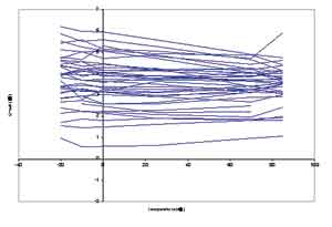 帶隙基準源中的電流級存在一定的生產差異(productionvariation),使得25℃時的基準額定值、曲率形狀和曲線最平坦部分的位置都會發生各種變化,因此需要進行工廠校準,以盡量減小這種變化的影響,圖3所示為一個未校準基準源帶來的變化實例。在-20~+85℃的溫度範圍內,最高差異為-0.9~0.20%。而圖3則顯示有兩個離群點的曲線跟大多數其他器件的曲線有相當大的差異。