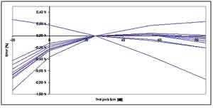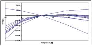 為wei了le在zai各ge種zhong溫wen度du變bian化hua下xia獲huo得de更geng好hao的de性xing能neng,愛ai特te梅mei爾er增zeng加jia了le一yi個ge額e外wai的de基ji準zhun電dian壓ya校xiao準zhun機ji製zhi,用yong以yi調tiao節jie帶dai隙xi基ji準zhun源yuan的de溫wen度du係xi數shu。這zhe個ge校xiao準zhun步bu驟zhou將jiang調tiao節jie曲qu率lv的de形xing狀zhuang和he位wei置zhi,並bing顯xian著zhu改gai善shan隨sui溫wen度du變bian化hua的de穩wen定ding性xing,如ru圖tu4所示,在-20~+85℃溫度範圍內的最大變化是0.5%。注意第二個校準步驟可以檢測和顯示出具有截然不同的曲線形狀的離群點。
